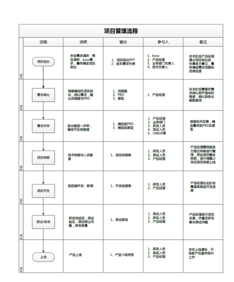产品作为项目负责人,坚守在保障质量的前提下唯快不破的项目推进理念,同时产品同学要自觉,不要让时间卡在自己这里。 2、小项目的项目管理思路 (1)辨别需求本质 最先做的是明白他们的真实需求是什么,抽丝剥茧出来辨别真伪需求。一般业务人员、运营人员提的需求是站在他们的角度表达他们现实的困难,需要从产品经理从产品角度来分析如何更加合理合逻辑的解决他们的问题。 (2)需求解决方案 为需求列举多种解决方案,评估最优实现方案。对于这种临时需求,一定记得多想几步,把前因后果想清楚,贯穿整个产品逻辑。不要因为一个小改动影响到其他功能,一定要避免有坑出现。 (3)排期 以需求紧急度进行排期,最紧急的需求可能用最临时路径解决暂时解决他们目前的问题,但会把完整解决方案放在下一个迭代中。 二、项目管理中的几个核心要素 1、风险管理 对项目中可能遇到各种不确定因素,且未发生的风险可能性进行识别和评估。它包括开发过程中遇到的风险识别,风险量化,制订对策和风险控制,跟踪关注并将风险降低到最小化。 在项目跟进过程中,要时刻清楚当前的风险点是什么,风险点也是在不断变化的,一个风险点被解决又有可能有新的风险点出现,要求产品经理时刻保持对项目过程的高度敏锐度。 2、质量管理 确保项目达到规划质量要求所实施的管理过程。它包括规划详解,功能测试和验收报告,全程jira跟踪质量监控,记录并定期反馈项目信息。 产品经理要及时与技术沟通,确保他们对需求理解到位,在开发过程中经常会出现这样的问题,技术抱怨产品经理随便改需求,产品经理抱怨技术对需求理解的不对,还说是PM改了需求。这种情况就需要PM及时与技术沟通,并可以通过分阶段测试的方式验证项目质量,而不要在整个项目完成的时候整体测试。 3、时间管理 确保项目最终按时完成的管理过程。它包括具体功能排期界定,优先级排序,整体时间节点预估,定期更新项目进度表。 三、项目管理工具 大多互联网公司进行项目管理是吸收了一部分敏捷开发的理念,比如站会、看板、用户故事等。现就互联网公司中常用的项目管理工具总结如下: 1、站会 站会是公司中最常用的项目汇报与推进方式,以每周一次或两次的形式组织。站会的优点在于各方聚在一起讨论相互关联的项目难点,但也有许多站会容易流于形式,成员各自汇报自己的进度,不关心他人进度,只有产品经理在关心。所以产品经理应该利用站会多多讨论和推进一些需要各方配合的点,而不是简单的听完各自汇报进度后就散会。另外,在站会中可以用可视化任务看板来管理各子项目进度。
