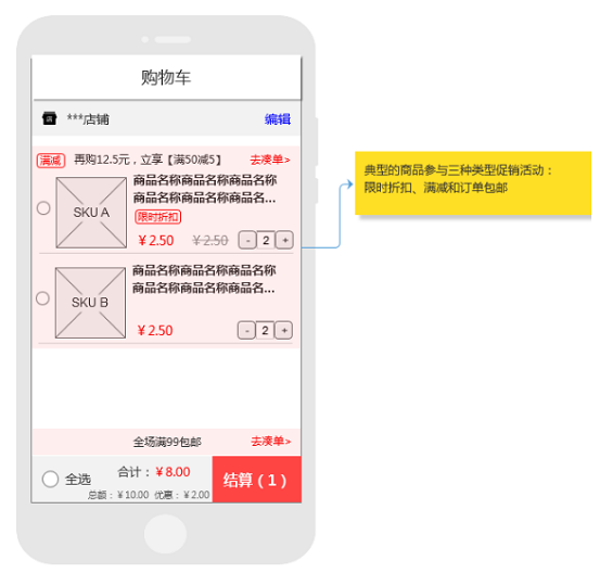 京东618大促落下帷幕,伴随着1199亿元的销售业绩令人瞠目,如此庞大的促销活动,是如何做到的?如果一个商品既参与了特价销售、又参与了平台跨万店满减、还参与了店铺内的优惠券减额等等促销活动,那这个商品会不会存在不要钱白送的情况? 当然,你可以认为笔者在杞人忧天,就算亏那也是京东的事情,但是笔者并不是要讨论京东赚了或者亏了多少钱,而是要说这考验的是产品设计者的智慧。 在这篇文章中,笔者总结了设计电商促销系统的基本原则: 同类型通过实体进行互斥、不同类型可以相互叠加。 笔者大致描述这条原则如下:在你设计促销功能时,需要考虑当前促销功能是属于以下哪种促销类型,再使用这条原则通过实体(这里说的实体是商品或者订单)和其他促销功能进行逻辑互斥。 三种促销类型:修改价格类型、修改商品小计金额类型和修改订单金额类型 例如:如果你设计的促销功能是秒杀,那么这个活动就属于第一种:“修改价格类型” 的促销活动,它需要通过实体(商品)来和 同类型其他促销活动 进行互斥,也就是说:在设计秒杀活动功能时需要考虑到参与秒杀活动的商品不能同时参与其他修改价格类型的促销活动。而,这种类型的促销活动有:拼团、限时折扣、降价拍等等。 以上为背景和回顾,下面正式进入本文内容: 就如笔者之前所述:这条原则是没有考虑任何使用场景、完全基于系统计算逻辑总结的规律,但是就连笔者也无法回避电商产品是由运营驱动的残酷现实。这也就决定了,这条原则如果不符合用户使用场景,不能提高运营效率也终将是一个自嗨的结论,没有任何价值可言。那么今天,笔者就将进一步阐述这条原则能否满足实际使用场景的要求。 所谓实际使用场景,无非就是线上和线下两种情况,本文将结合电商购物车这个促销重要载体来对以下五种不同的情况进行逐一分析: