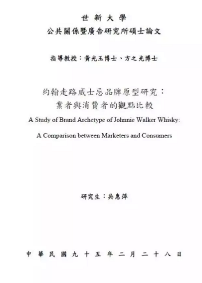 2012年,我在网上搜索品牌相关心理学知识时,无意之中找到台湾著名传播院校世新大学的一篇硕士论文——《约翰走路威士忌品牌原型研究》。