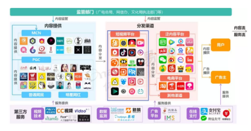 从行业产业链可以看出,整个短视频行业涉及到内容提供、内容监管、内容分发渠道、用户、广告主和服务提供商。