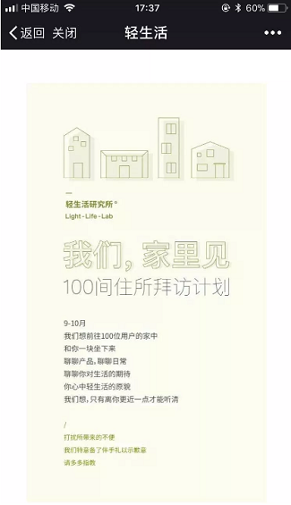 此外,轻生活还经常邀请用户到公司来参加活动,又或者让员工到用户家里去,跟用户深入交流。这些活动都在不断强化轻生活的品牌对用户的情感价值。