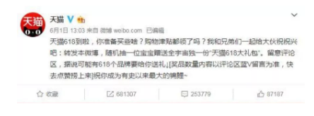 618期间天猫为了造势,在微博上发起了一个抽奖的活动。按理说微博抽奖送礼已经是各个品牌熟悉得不能再熟悉的日常操作了,但是这次天猫硬是把这种常规操作玩出了新高度。
