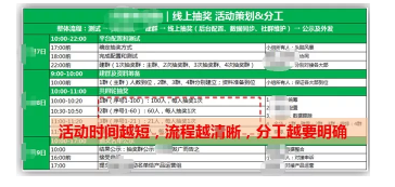 “这个问题问的很好。其实,活动时间越短,对流程以及分工的要求越高。”老大接下来讲了一个线上抽奖的案例,里面时间的划分精确到了分钟。