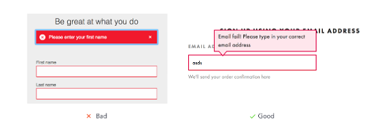 记住错误验证 使用内联验证 避免错误摘要,在输入旁边放置错误消息。一次显示一个字段的错误消息。 图片来源:LinkedIn,Asos 使用清晰的mircocopy检查错误信息 它应该告诉用户为什么他们的信息被拒绝以及如何解决它。错误信息语气应该是有礼貌且专业。