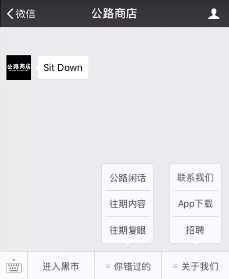 我们来理一下从关注公众号到接受其具体的内容,首次关注「公路商店」的时候后台会自动跳出一句很“公路商店”的话术:“Sit Down”。