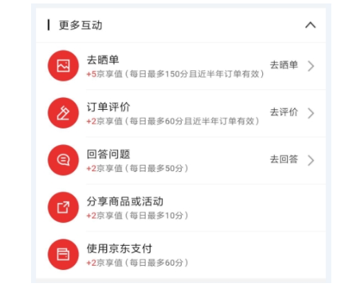 互动部分则属于任务系统,会员进行下列互动任务即可增加京享值。