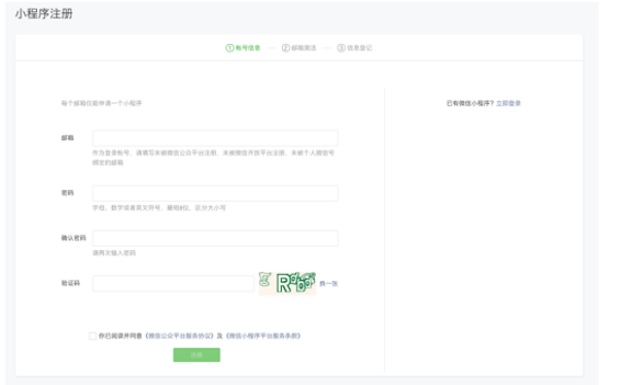 APP和小程序对比 当然以上突出了小程序的很多优点,但是现阶段小程序还有一些不足的地方,比如:在微信中入口太深,没有APP在手机桌面上打开方便,同时当前阶段不能实现那些功能相对复杂,交互相对繁琐的重服务。 结合我们的产品功能定位和用户定位,产品主要提供信息撮合和简单交易功能,并不需要功能复杂的服务,同时在小程序红利期间,可以很方便的在微信体系内推广引流,最后项目选型用小程序搭建平台。 做小程序不是为了跟风,不是为了新潮,主要是抓住根据小程序的特性,同时在微信体系内,最大效率的利用小程序的传播属性,连接起我们想要的用户。 二、小程序的准备和上线 1. 注册小程序 注册小程序的主体同微信公众号,为企业主体或者个体工商户需要,提供营业执照相关资料、管理员邮箱、身份证姓名和号码,一般注册审核1-5天。