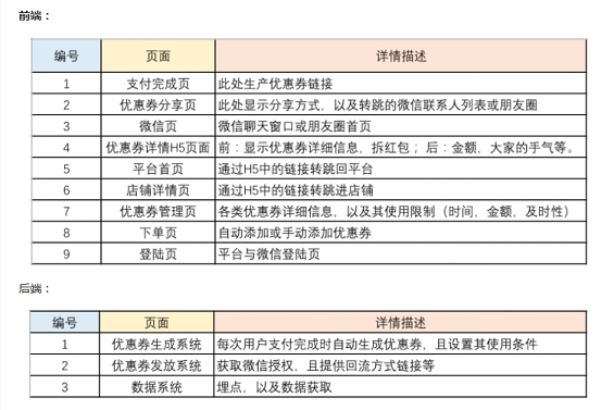 核心在于H5是否能能否传播开来引导新老用户参与,以及优惠券是否能够打动新用户注册,老用户再次消费。 用户-场景-需求-产品需求