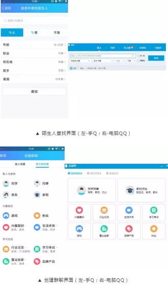 截取了添加好友中的陌生人查找和创建群聊两个功能模块,可以看到:除了陈列板式不一样外,内容基本是一致的。