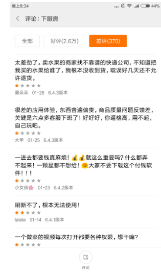 3.2 市集功能 目前app中市集功能的主要体现区域有厨房好物、生鲜料理包、市集折扣精选、市集等,主要目的是经营食材和厨具等,其功能和界面设计更类似于淘宝,下厨房想把app打造成一个专门经营厨房类产品的电商平台。 目前此区域的产品销售量和评价都比较多,可以看出已经步入稳定经营的状态,并且,下厨房还专门经营自己的自营产品,其策略类似于京东自营,旨在打造菜谱、厨房用具、食材一体化的品牌,并且也和淘宝的一些食品商家合作,进一步扩大了用户群体。 但是根据用户体验后的评价,发现目前市集方面功能还存在着一些缺点,一是市集在主页做的宣传太多,几乎和菜谱不相上下,有种喧宾夺主的感觉。二是市集里面东西体验较差,让用户不爽。