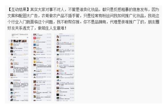 [思路网注] 微信朋友圈是广告重灾区,到处都是洗脑式招代理,秀支付宝收入,购物链接,广告陷阱,很多曾经喜欢玩朋友圈的人玩的少了。 请原谅我的坦率,一开始,我就打算给大家泼一盆冷水!注意,我说的每句话都是为你好,绝不害你!《2014年下半年小微商还玩的下去吗?》的终极答案,我告诉你——没的玩了! 1、如果直到今天,你还在犹豫到底要不要做微商,你就要仔细盘算一下自己手里的资源,如果你有“时间精力耐心坚持”、“客户基础与客情关系”、 “专业知识”、“货源优势”、“做生意的经验”、“抗风险能力”,那你可以进来试试,如果上述资源,你一样都不具备,那就别进来搀和了,你现在所有的奋不顾身都是极其危险的飞蛾扑火,不要被你的上家洗脑囤货。为什么我在这大放厥词,胆敢拍着胸脯劝你放弃呢?因为大环境变了!老匡给大家说一个已经是铁板钉钉、不容反驳的事实: A、微信活跃用户数已经饱和,目前的增长率几乎为零(注意用词是已经,而非将要); B、朋友圈活跃度急速下降; C、微商红利期已过! (例如所有要做我精油与面膜代理的朋友,我都会问,你有没有客户基础?如果没有你就别做,不是看不起你,是不想坑你,因为谁也没能力去力挽狂澜,挽救微信日益下滑的局面,时势造英雄,而非英雄造时势!) 2、如果你已经是微商,但是每个月的流水做不到10000块钱,那我劝你直接放弃,老老实实去找份工作,为什么呢?因为做全职微商,只有做到流水10000块,才能保证你的月纯利达到6000块,另外3000-4000块钱你要进货。其实,作为全职微商来说,一个月挣6000块,那根本不叫赚钱,那叫维持生活,或填饱肚子,随便你怎么定义,那不重要! 但是——你竟然能在微信朋友圈这个毫无成熟盈利模式可言的乱七八糟的大环境下,一个月竟然能挣到6000块钱,那以你的聪明智慧,你出去找份工作,挣5000——6000就跟玩一样,况且,你出去工作几年绝对能在某个行业混个脸熟,收获人脉;又或者可以在某个专业环节成为专家型选手,方便以后厚积薄发,过的舒服没压力又有前途。但你做微商,为了挣这5000——6000,你每月都要固定投入3000——4000的货款和所有的时间、精力,赚着卖白菜的钱,操着卖白粉的心,不划算。 如果你做全职微商,月流水已经做到10000块以上,那我劝你继续坚持! 为什么我没完没了的劝大家放弃呢?还是上面的结论——大环境变了!我是为你好!明白吗? 吹完牛逼,现在开始罗列数据! 1、微信活跃用户数已经饱和,目前的增长率几乎为零: A.基于腾讯官方发布的赢利报告数据,为了判断自己的直觉,老匡最近追踪了一下腾讯官方发布的盈利报告数据: 从数据看,绝对是一片惊艳,但老匡尝试计算增长率时,就得到了一组惨不忍睹的数据: B.我就知道,机智的朋友一定会跳起来反驳老匡说增长的慢,是因为微信本身基数庞大,在这么庞大的用户基数上,依然还在增长,已经伟大的不像话了。 对不起,老匡还有一个致命理由,就是老奸巨猾的腾讯悄悄修改了“活跃用户数量”的统计方法——2013年第3季度以前,腾讯统计活跃用户的方法是“用户在微信或Wechat上至少发送一条信息”,2013年第3季度以后,腾讯的统计活跃用户的方法是“至少发送一条信息,或至少登录一次微信上的游戏中心,或至少更新一次朋友圈”。 也就是说,腾讯对微信的月活跃用户数的计入方法放宽了,此前必须发送一条信息才算活跃用户,现在连登录一次游戏中心或更新一次朋友圈,也算上了。 进一步解读,可以理解为:腾讯可能将不用微信交流,但纯粹登陆微信并通过微信玩游戏的人也算做微信的活跃用户了,这个就有点无耻了。 因为有的用户就是只玩游戏,不玩微信的,数量还不少,你甚至可以算出来。 怎么算呢? 前面说了,2013年第3季度微信的活跃用户是3.36亿。 修改统计方法后,2013年第4季度微信的活跃用户是3.55亿。 而微信在2013年第四季度推出了4 款新游戏,分别是《天天飞车》、《全民英雄》、《全民飞机大战》、《欢乐麻将》,此外,在12月进行版本更新的还包括《天天爱消除》、《欢乐斗地主》、《节奏大师》,这些游戏相当多数都排在APP Store前列。有理由相信,这多出的1900万活跃用户,主要来自微信游戏中心的增长拉动。 所以说,如果刨去纯粹用微信玩游戏的那群人,微信在2014年5.65%、11.54%、10.60%这些渺小的数据只能说明——新用户几乎没什么增长,或者说基本停止了增长,甚至还有所下降。 C.为什么微信新增用户乏力呢? a\微信市场饱和,在中国能使用微信的人基本上都在用了。 b\当然有小微商的功劳了,微信朋友圈是广告重灾区,到处都是洗脑式招代理,秀支付宝收入,购物链接,广告陷阱,很多曾经喜欢玩朋友圈的人玩的少了。 c\怪腾讯自己不争气,想钱想疯了,现在的微信已经不再是纯洁的交友社区了,被腾讯弄成了一个集团购、理财、游戏、电商于一体的怪物。 d\微信做大了,动不动就封杀自媒体公众号,让很多拼了老命经营的公众号,一夜消失,现在网上说公众号没用,不好做的文章一搜一大把,不信你看看,都是那些受害者写的。 e\最后就是任何产品都有生命周期,都会经历成长、成熟、衰退期,没有例外,而且互联网产品的迭代周期更短,从几乎消失的开心网到微博,都是例子,不必惊讶。 2、朋友圈活跃度急速下降: 老匡8月24号中午12点49分,在朋友圈发了微信整体活跃度至少降了30%这则消息,然后被各种朋友追债一