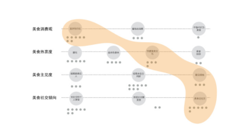 当然,如果在连接关键变量的信息值时可以两个原则兼顾,则我们制作出一个成功的persona的概率则会大大增加。 到这里,我们的用户聚类工作基本已经完成了,为了帮助大家理解,我们选取唐硕之前的一个项目作为案例说明。该项目是受某公司委托研究美食消费的用户行为,也就是研究吃货。 通过一系列的调研,我们收集到了丰富的吃货行为特征。通过分析,我们选取了“美食消费观”、“美食热衷度”、“美食主见度”及“美食社交倾向”作为影响用户美食消费行为的关键变量,并将关键信息值及用户行为特征数量分布进行了一一标注。 接下来就是见证奇迹的时刻! 通过按照以上两个原则的连接尝试,我们最终聚类出了三种典型的吃货。