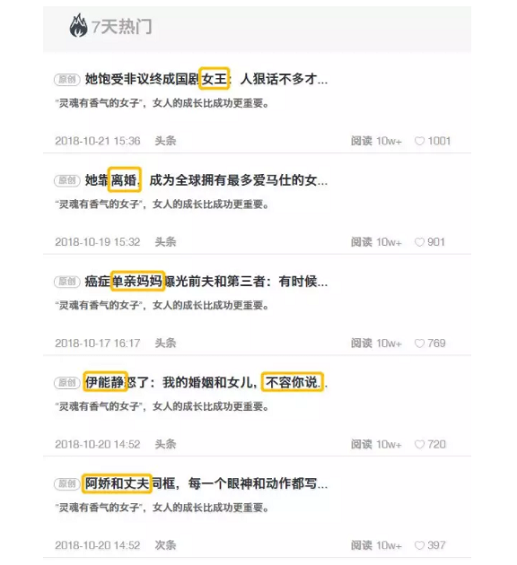 那么类似“女王”、“离婚”不等于重创、“单亲妈妈”也可以很勇敢等等,自然也就成为了爆款选题的关键要素;当然,另外还可以搭上一些明星热点,也能够成为吸引眼球的要点。