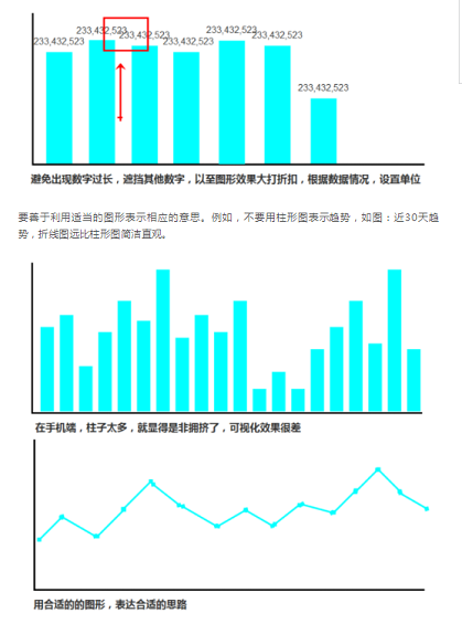 图形带出的信息不能太多太乱,例如柱形图,不能把每个柱子都带上数字,当数据很大时数字叠加看不清楚。可以考虑点击后,显示数值。