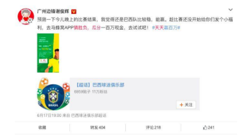5. KOL微博、朋友圈 前文提到了,分享免错卡不仅可以获得一次免错的机会,还可以获得分红奖励,使用你的免错卡下载马蜂窝并答题的用户,如果他猜对了本场球赛,你也可以获得一定比例的分红。这种赤裸裸的现金诱惑,促使有大量粉丝的KOL主动转发分享到自己的社交平台。