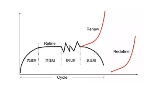 进入挣扎期的公司,有两条路。一条叫Renew,在原有业务的基础上创新,带来下一波增长,比如京东从3c拓展到家电、图书……比如阿里从阿里巴巴延展出了淘宝。