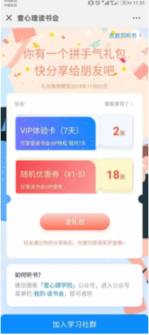 在正式推出壹心理读书会前一周,他们做了一个预热活动,在种子用户渠道小范围测试了次,裂变了几千用户。