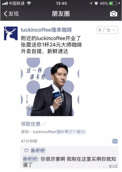 四、连锁咖啡界:咖啡三雄的新零售 那么,我们来看下当下连锁咖啡品牌里的咖啡三雄的新零售模式。 除了外卖,他们是怎么做新零售的呢?他们的运营,产品,销售模式是怎么样的? 1.瑞幸咖啡 小蓝杯-瑞幸,17年10月才成立,一出来就宣告自己是全新的新零售模式做咖啡。 瑞幸宣传的模式是:咖啡+O2O+新零售。 新在哪里呢?瑞幸咖啡所有的线上线下点单,支付,都是在自己的APP上面。 目前,消费者购买一杯咖啡,主要有三种方式:到店、自提、外送。 比较特别的是:当你实际去瑞幸咖啡的门店里,看不到很详细的菜单和品类介绍,而且,很多店并不接受现金支付。那怎么购买和结账? 这个时候,消费者需要在下载一个专门的瑞幸咖啡app,下载安装好后,就会看到详细的菜单和最新的活动,无论是外卖还是到店,都可以在app上面直接下单支付购买。这个方式的确很特别。 有消费者买完后感慨:app太麻烦了。然后在从门店转瞬离开的电梯屏幕上,还有微信朋友圈屏幕上,就收到了附近瑞幸咖啡门店的广告。果然,这个广告很及时,很精准。