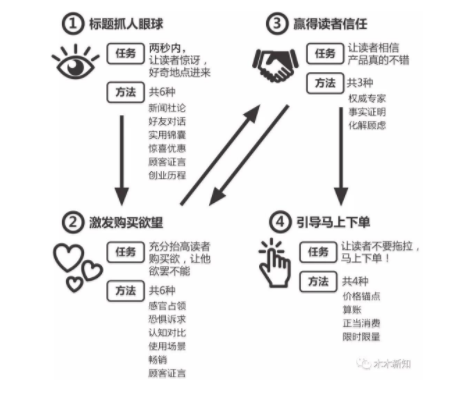 我曾经也尝试,想把这些硬骨头一个一个啃下来。 但看多了干货,你会发现:同一个内容,不同提炼者从些许差异化的角度,就可以给你提炼无尽的干货。想把它们全记下来,在工作中落地运用,会发现内容过多,经常混淆。 心中隐隐有似曾相识的感觉,好像总结得都有些共性,但又不知道在哪里。 比如关健明老师的《爆款文案》中,将文案的分为四步,每一步教你不同的套路和方法: 标题抓人眼球→激发购买欲望→赢得读者信任→引导马上下单