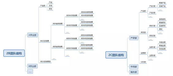 这两者之间的差距,来源于公司发展的基因,原始基因。从团队组织结构,就可以鲜明对比出来。