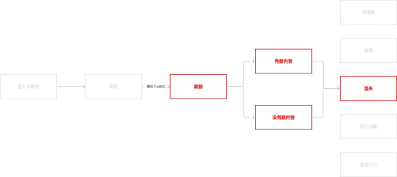 从课题能获知到的关键行为有刷新、流失这两个关键节点,将这两个节点连线,发现中间的部分是刷新后的反馈,也就是刷新有内容,刷新没内容: