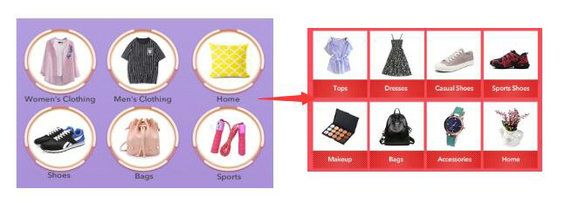 5. 类目模块的设计。展示什么类目,展示几个类目是这个模块的难点。给大家分享两个诀窍:综合频道2排8个热销类目,类目频道(男装、女装等)尽可能展示详细的类目。 新客频道从原先的6个一级类目,变成8个二级类目。原因在于二级的热销类目会比一级的类目点击量更高,比如说tops上衣要比clothing衣服这样的展示形式更好。