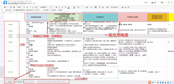 以月为单位建立一年12个sheet,反思表格首行横坐标为反思维度,首列纵坐标为反思日期。