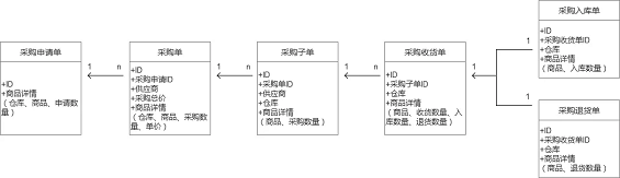 在采购的案例中,基于一个采购申请单可以根据不同供应商创建多个采购单,那就是一对多;一个采购单可以多次发货,采购单和发货单也是一对多;一个采购收货单只能一次全部入库或退货,那就是一对一。