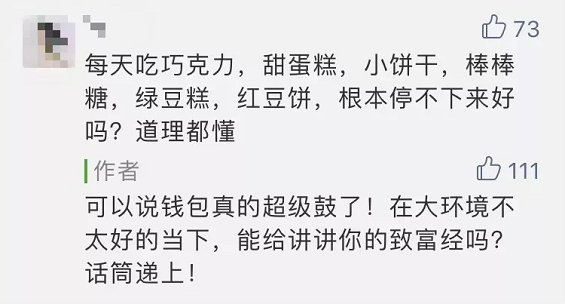 这篇文章讲的是“甜点对肥胖的影响”,文末的互动是“算算你每天无意中吃了多少含糖食物”。 这个读者罗列了很多零食,最普通的回复就是“劝她赶紧戒掉”,或者问问“有没有胃口比她还大的人”。 这里可以看到我的回复,虽然偏离了重点,但是侧面夸她每天吃这么多一定很有钱。 得到了一百多个赞,说明其他读者是认同这个回复的。