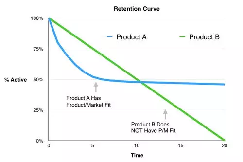 A产品到达某个节点以后,用户流失便趋于平缓,可能第一个月流失50%,但接下来几个月的剩余用户流失都在10%以下,到达这个留存曲线的时间越短,代表PMF的契合度越高。