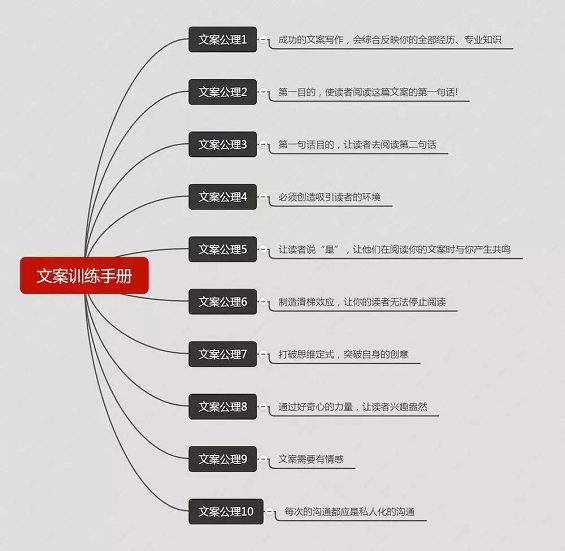 而文案要想写好,能把产品卖出,可以借鉴《文案训练手册》里提出了文案写作的十个公理,如图: