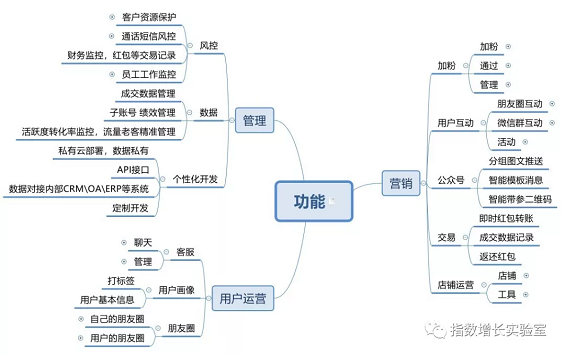 从营销看,包含加粉、用户互动、公众号接通管理、电商店铺接通管理、交易的功能;从用户运营看,包含客服功能、用户画像、朋友圈功能;从管理看,包含风控、数据和个性化开发的功能。