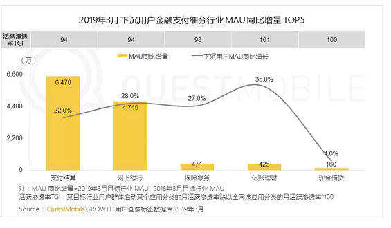 2、社交、娱乐、资讯是下沉用户最常用的应用类型,其中,下沉用户在泛娱乐类(移动视频、移动音乐)、移动购物、金融支付的用户增长尤其明显