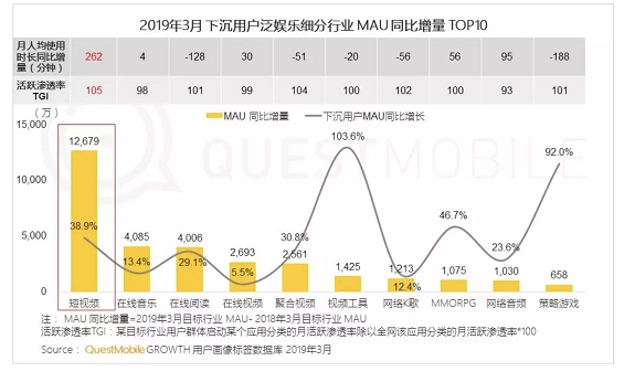 5、泛娱乐行业:满足了下沉用户杀时间需求,短视频成为下沉用户规模、时长增长最为突出的行业,在线音乐、在线阅读等也吸引了大量下沉用户