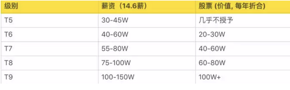在腾讯,技术线在此之前属于 T 序列,在腾讯的职级体系里,T3 级别已经是很多人的上限,行走江湖有名有号的 T4 级别更是当得起各技术分享大会的技术爱好者们一声老师的称呼。而 T5 级别在整个腾讯也是凤毛麟角,代表人物有玄武实验室的于旸、优图实验室的贾佳亚等。 InfoQ 搜集了腾讯新职级体系下的薪资水准和股票价值,具体参考下表: