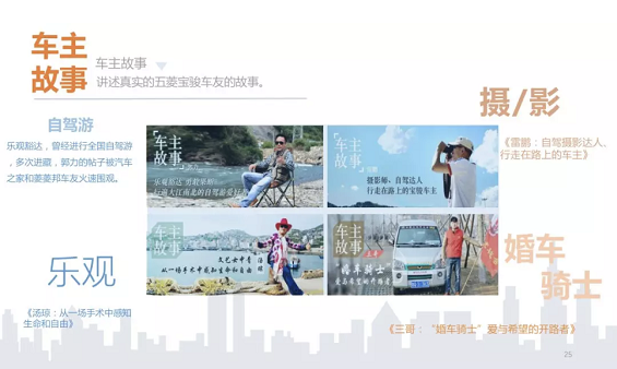 例如云南女车主-汤琼,一个70后,一直想追求自由,但是上有老下有小被家庭所束缚,直到生了一场大病,她觉得人生需要为自己而活,所以出院后为自己买了一辆车,开始喜欢自驾喜欢拍摄的生活。 例如我们包装了开百量五菱之光迎亲的车友会“三哥”的故事:《奔驰宝马瞬间被秒杀》,当时他的视频播放量近千万,一举拿下百度和头条的首页推荐。