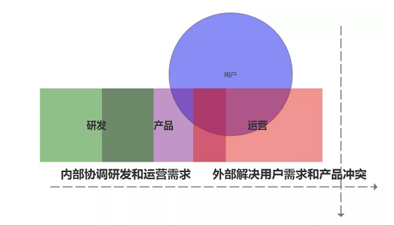 最近有朋友加老付说他现在正从事内容运营,想争取换到更高大上的用户运营或活动运营来,老付给他的建议是放平心态,不管哪种运营,都不是啥高大上不得了的工作。运营就是一件需要目标导向和超强执行力的活儿,和产品经理的区别就是后者更强调对内部资源的协调和整合,比如做平衡研发和运营的中间人,而运营则是外部和内部都需要解决矛盾、满足需求,如下图,各自的交集关系以及交集比例不同代表角色分工和业务方向: