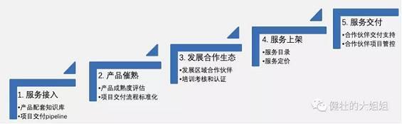 1. 服务标准化 站在客户的角度去梳理本产品的销售流程和推进策略,每一个流程里需要配备的资料和工具,变更事件的风险控制和问题升级等,将整体的打法模板化和场景化。 其中,尤其要重视价值链里的相关基本活动,如供应商管理、生产、分销流程、销售支持、客户关系管理等,这些是关键的环节,需要布局对应的标准化服务,避免将自己置于一个关键路径上。 下面是我负责的产品在联合公司内其他团队的力量,完成产品服务标准化接入的全过程,包括从服务接入,到产品催熟、发展合作生态、定义服务目录和商业报价,再到服务交付的标准化。