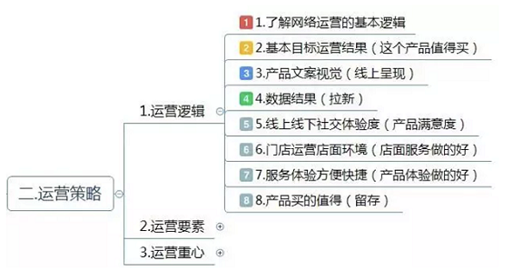 前几天在找怎么写网络运营方案的信息,碰巧看到下面额思维导图,仔细一看还真是很全面,方案的框架、运营逻辑、运营重心、人员安排、执行考核都一一罗列示范。我看完这个导图后收获不少,所以想拿出来给你们参考。 如果你是经历级别正在为活动安排而烦恼,那么这份导图正好适合你。如果你是活动运营人员那么这份企业网络运营方案同样适合你,它能帮助你从大局上了解一次活动的框架、活动重点;你也可以从中了解一次活动种怎么有条不紊的安排执行及人员分工、考核等等。 这份案例电商网络运营方案,千万不可盲目搬抄,但在这份方案里可总结出运营方案的框架以及一些拉流量、留客户的运营手段。 一.运营目标 明确目标是整个活动的核心,一切手段策略以目标看齐,目标尽量量化,具体。方便对活动的调整以及活动结束后评估。