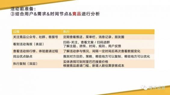 上图是竞品分析的模版。用来平时多积累、分析竞品的案例。显性内容是:主题、时间、规则、奖励。隐性的内容:它的目的、成本、风险控制方式、数据、宣传渠道、执行节奏。那记录后具体该如何分析呢?