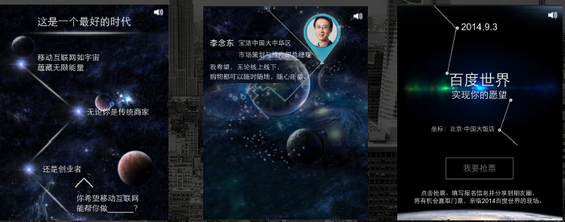 7、2014百度世界 入选理由:美轮美奂的邀请函 集视听多重感官于一体的H5还改造了千人一面的邀请函。 标杆案例如今年的百度世界大会,将会议邀请和星空元素紧密结合:在一片唯美的星空背景之上,每划过一道流星,就浮现出一位意见领袖对移动互联网的看法和愿景,最后是会议的时间地点,并可进行在线抢票。(#纳尼,又是百度的?!TOP君就不展开说了,夸那么多一分钱没收到何必呢?#)