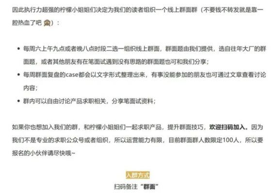 秋招的时候,考研的时候,加入各种各样的微信群能够让我们获取到尽可能多的信息。 基于兴趣的微信社群可以拓展我们的社交圈——当然这不是说加了新群就疯狂加好友,而是通过沟通和交流认可彼此的价值,愿意发展群友以上的好友关系。 所以,今天来简单聊一聊微信群这个特殊的产品。 为什么它是个产品? 因为作为拉群的这个人,也就是群主,你有着本群最大的话语权,由你来定义这个群的形态,哪些人可以参加,游戏规则如何,所以你就是这个微信群的产品经理,而群就是你的产品。 很多小伙伴提到说没有时间去实习,又不知道做什么线上项目,很多人会选择跟风去做公众号,公众号当然很好的自我成长和实践能力的方式。 但公众号要求有持续的输出,以及相对较高的运营成本,很多时候一个人很难找到合适的方向并且坚持做下来,所以我建议可以从做好一个群开始。 那么,这个产品特殊在何处? 1)上线成本极低 对于一个新人产品经理而言,微信群这个产品省去了开发和测试步骤,可以在写好产品需求文档之后独立上线,由你一个人完成产品的全流程,直接面向用户。 2)产品能力要求高 尽管直接拉一个群或者建一个群二维码然后分发出去非常简单,但用户-场景-需求一个都不能少。 一个定位不清晰的产品用户是很难买帐的,最后的结果就是群聊热热闹闹开场,静静悄悄离场。 3)潜在用户量大 微信群聊作为一个内嵌于微信的产品有一个得天独厚的优势就是庞大的潜在用户。 理论上来说,微信的10亿用户都有可能成为你的群聊用户,即使不是你的好友也有可能是你好友的好友的好友,以及基于互联网极低的复制和分发成本可以让群二维码无限的分发。 所以,只要你的产品能够提供价值,不愁没有用户。 4)用户即产品 群内的每一个人都是你的用户,但同时他们也是你产品的一部分,你对产品的定义影响着他们在群内的行为。 他们对产品的使用行为和反馈又帮助你界定产品,他们创造的价值成为你产品的一部分,这一点类似于一个小小的社区。 所以,针对这个特殊的产品,怎么做好一个群聊?基于去年秋招自己搭建柠檬群面社群的经验浅谈一下我的思考。 Part 1 做个有灵魂的社群 首先,我们要对社群有一个清晰的定位:是熟人群还是网友群? 熟人群其实就是线下关系直接搬到了线上,比如班级群,比如室友群,比如家庭群,这些群是基于真实存在的强关系的,用于日常事务的沟通,可写的文章很少。 所以,我们主要谈第二种:网友群。 过去大家要认识新朋友要获取信息要社交的话需要参加各种大大小小的活动,但这样的社交很低效,且精力和时间都是有限的。 所以,微信群聊给我们开辟了一个新的社交途径:通过加群来认识新的朋友,链接更多的资源,交换更多的信息(当然信息本质也是资源)。 网友群又可以细为两类:工具群和兴趣群——其实就是不怎么说话的群和必须最好天天说话的群。 工具群往往有着很明确的用户场景需求,且能提供稳定的解决方案,比如学校的内推群。 我们学校有个非常厉害的校友组织的内推群:即使大家平常都不说话,但这个群也不会糊。 因为等到校友有招聘需求,同学有求职内推需求的时候,这个群随时会在,而且随着链接的有效人脉越来越多,群的价值会越来越大。 再比如社区团购群,有团购需求的时候打开这个群看看有没有新的团购消息即可,只要你存在团购需求且老板能提供这个服务那就永远不会退群。 这类社群搭建成本高,但运营成本较低,不需要绞尽脑汁的活跃群,因为群的活跃指数根本不是核心KPI。 而第二种兴趣群才是我们今天讨论的主体,更接近于社群了:大家有共同的背景、身份或者兴趣爱好,通过社群共享信息,在群内有信息的流转和交换。 一个群聊成为了社群才有了灵魂,否则就是一个没有感情的工具。 我们之前做的柠檬群面群就属于兴趣群的一种:虽然我们是通过社群为大家提供组织群面的服务,但由于我们不是商业化的机构,不需要通过群面赚钱也不需要通过社群卖课。 所以,在建群之初,我们的目的就不是做一个纯粹的功能群,只是机械的发起群面-组织群面-然后结束群面。而是希望通过群面的方式,筛选和我们一样正在经历秋招,并且苦于群面的朋友,一起练习群面的同时交流秋招心得和体会,共同进步。 Part 2 定义你的产品:用户-场景-需求 那么想好要做一个兴趣社群之后,需要进一步思考你的用户-场景-需求分别是什么,产品给出怎么样的解决方案。 以我们做社群的思路为例,梁宁老师在产品思维三十讲提到过,恐惧是痛点,是产品有力的抓手。 对于参与产品/运营岗位的秋招同学,恐惧什么呢? 大家最大的恐惧肯定是怕找不着工作,但我们没有办法帮大家找到工作,所以只能找到细分的恐惧去提供可能的解决方案。 因此,我们针对如下两个方面的恐惧提供了解决方案: 1)害怕错过秋招的重要信息——搭建微信群,随时随地共享信息。 2)群面环节考察综合能力,通过率较低,害怕无法通过群面——基于微信群线上组织群面通过增加练习次数的方式来帮助他们克服对群面的恐惧,并逐渐学习群面的方法和技巧。 由于很多时候信息的不对称性会带来天差地别的改变,所以大家害怕错过消息,会加入各种各样的秋招群或者信息共享群。 因此,单独作为一个信息交流群而言,我们和其他秋招信息共享群似乎没有差异化的优势。 那么