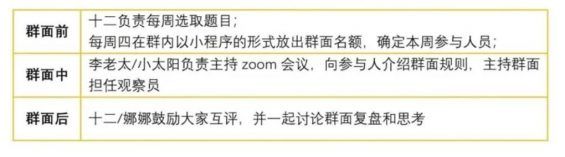 (0901-公众号社群招新推送截图) 我们详细的介绍了组织群面的具体规则,使得加入的每一个人都可以清晰的了解到我们为什么而做这个社群。 基于这个共同的认知,也保证了我们作为一个兴趣社群的定位。 Part 3 产品的核心功能:群面和交流 所以通过上述的分析,我们定义了产品的两个主要功能,组织群面和信息置换。 接下来要考虑的是,怎么基于微信群实现这个功能? 功能一:群面 当我们声称我们能够为用户提供群面服务的时候,我们需要搭建怎样的系统来保证稳定的提供这样的服务? 我们四个发起人就组织群面这件事做了详细的分工和讨论: