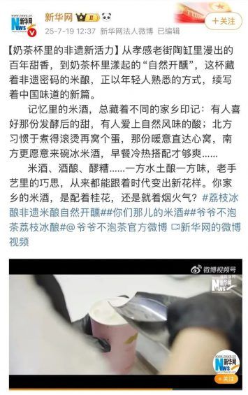 爷爷不泡茶正是精准的捕捉到这一趋势,重新定义了非遗米酿奶茶,并迅速成为该赛道的Top1,生生从巨头环伺的茶饮行业中劈开了一条大道。 并且,其对于非遗米酿的运用,并非是古早工艺或非遗概念的生搬硬套,而是借助品类间的融合,让传统文化得以借助现代化的产品形式得以体现,将停留在故事或传说中的非遗在全新的载体里焕发新生。 正如古人所云,米酒,闻之就想食之,食之就会醉之;而荔枝冰酿,则是饮之又能食之,食之就会爱之。 上新10天以来,荔枝冰酿两款焕新品销量已经突破260万杯,成为今夏最受欢迎的潮流饮品之一。