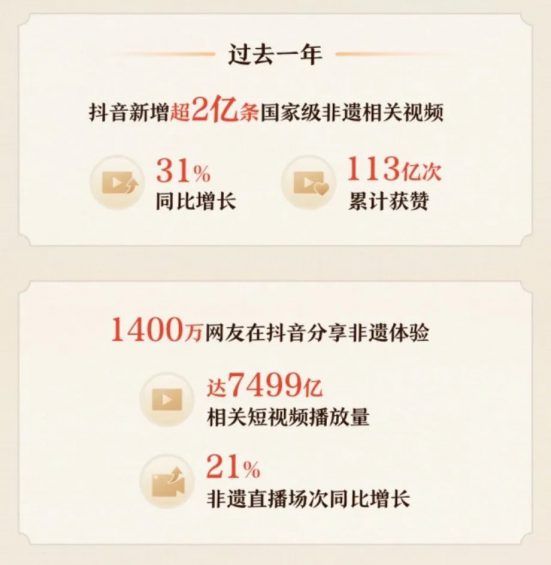 在此之前,茶饮从未与非遗挂钩,但这其实是一个巨大的富矿。《2025抖音非遗数据报告》显示,过去一年,平台新增的非遗相关视频超2亿条,同比增长31%,每天都有大量年轻人观看相关直播,但生活里很少有和非遗近距离接触的机会。