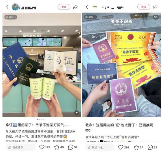 通过将产品与“夜经济”消费场景绑定,爷爷不泡茶着重打造喝荔枝冰酿“上班小确幸,下班更尽兴”的产品心智,将一批粉丝转化为长期的忠实用户。 二是对时事热点快速响应,积极交互,和用户建立情感联结; 今年高考期间,爷爷不泡茶推出“10万杯奶茶送考生”活动,消费者可以凭“证”领“空山栀子”,不成想却引爆了社交媒体,一时间,驾驶证,摸鱼许可证、甚至“天才证”都请求出战。 爷爷不泡茶则顺势而为,放宽了玩法规则,隔空喊话:有证您就来。因此成功将一场赠饮活动,升级为全民参与的社交狂欢,这无疑能建立起一个年轻、包容又有梗的品牌形象。