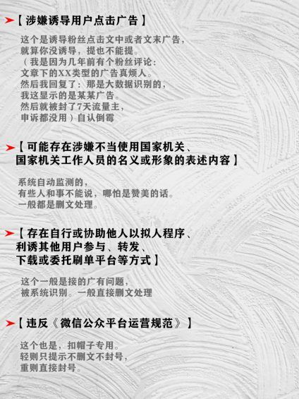 我把自己几个公众号共150多条违规记录和封号记录总结了下,希望其他做公众号的宝子们“引以为戒”。 我也体会过太多次,自己辛辛苦苦运营的号被封的那种感觉。