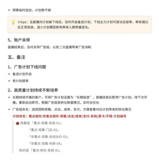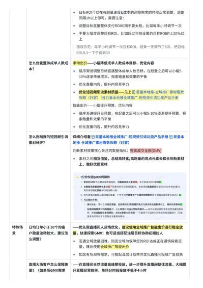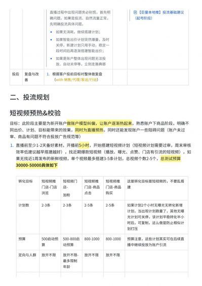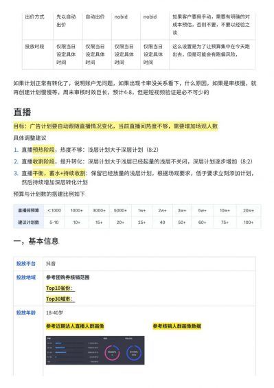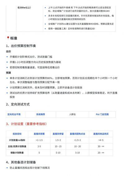 如果你是做直播带货的,或者是负责投流运营的同学,那么这份文档就是为你准备的。 简单来说,这是一份关于“如何在抖音做大场直播投流”的详细操作指南。 不管你是刚开始接触直播投流,还是已经有一定经验但总感觉效果不稳定,这里都帮你把整个流程拆解清楚了——从开播前十几天的准备,到直播中的实时调整,再到结束后的复盘优化,一步步都有说明。 我们会用最直白的话,告诉你该怎么定目标、怎么选账户、怎么搭计划、怎么调预算、怎么应对突发情况……甚至还包括怎么用好“全域推广”“智能出价”这些听起来有点高级的功能。 你不用怕复杂,我们尽量把专业术语讲得通俗,配合表格和示例,让你一看就懂、一学就会。 希望这份SOP能帮你少走弯路,更稳、更高效地完成每一场大场直播投流,真正把钱花在刀刃上,让每一笔投入都更有回报。