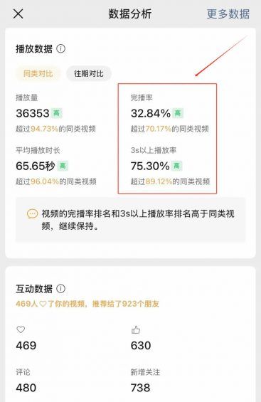 及格完播率 整体完播率 >15% 表示视频内容基本合格,能吸引用户观看完整视频。 视频号和抖音的3秒完播率及格线一般在40%-50%之间 优质内容标准 整体完播率 >30% 属于优秀水平,这类视频更易获得平台推荐,播放量通常是普通视频的3-5倍。 整体若完播率 >40%,则表明内容对用户有较强吸引力,可能成为爆款。 3秒完播率建议保持在60%以上,若低于此数值,需优化视频开头设计,如增加悬念、冲突或核心价值呈现。