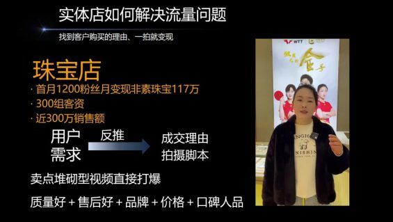 如我们做的珠宝案例,第一个月就变现300万,粉丝仅1000多个。我们把珠宝的质量、品牌、服务、售后、老板人品等卖点都堆在一条视频里,给用户3~5个成交理由,一拍出来就能变现。